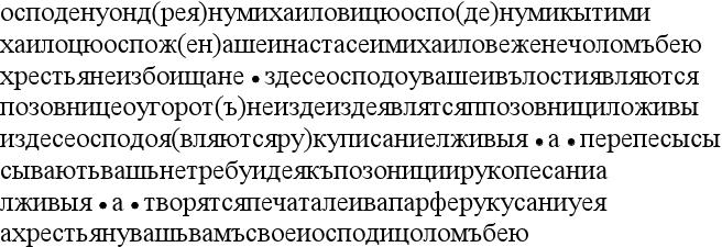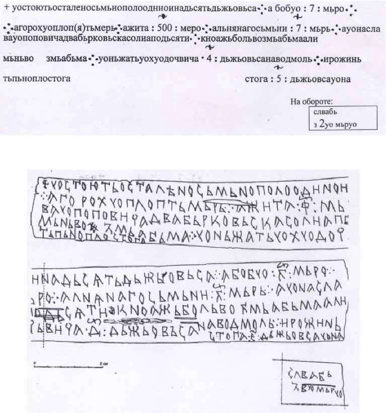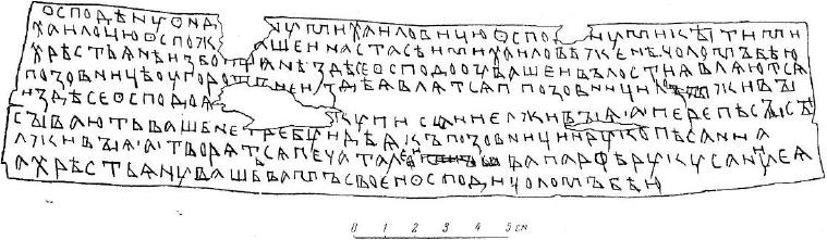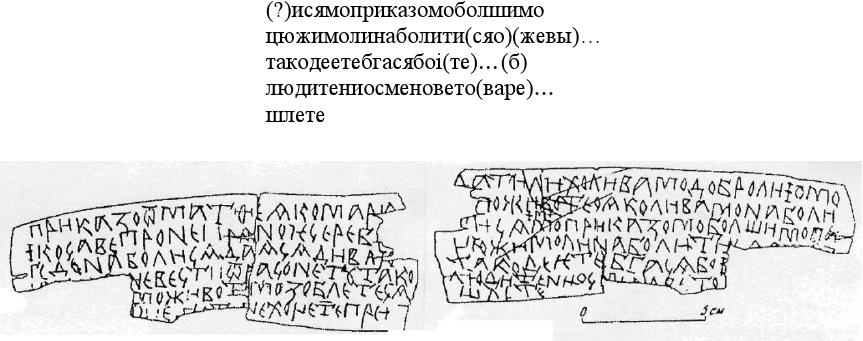(1) Перевод: "Господину Ондрияну Михайловичу, господину Миките Михайловичу, госпоже нашей Настасье, Михайловой жене, челом бьют крестьяне избоищане Здесь, господа, в вашей волости Горотной (?) появляются повестки, здесь появляются ппозовницы лживые, здесь, господа, появляются рукописания лживые | А | перепесысысывает ваш Нетребуй (и?) дъяк. Позовница и рукописания лживые | а | творятся. Опечатал рукописанияИван (?) Парфеев (?). А крестьяне ваши вам, своим господам челом бьют". Перевод имеет несколько версий, что связано с малограмотностью и / волнением писавшего грамоту.