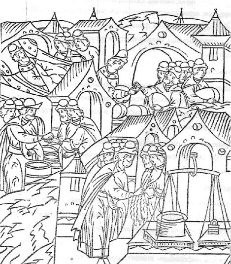 Рис. 36. Великий Новгород. Рынок: продажа хлеба и меда с использованием меховых и монетных денег; изображение товарных весов. [Летописная миниатюра].