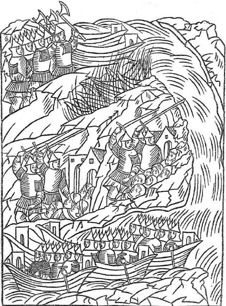 Рис. 37. Новгородские работорговцы-ушкуйники (XII в.). [Летописная миниатюра].