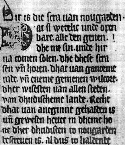 Сохранились русско-немецкие договоры от 1191–1192 и 1263 гг. Ганзейский союз немецких городов к 1370 г. объединил свыше 70 городов во главе с Любеком. Ганза имела отделения во многих городах в Западной Европе, свою юриспруденцию, флот, регулярно собирала съезды. Устав Ганзы – скра (Scra, Schragen – рис. 38)имел семь редакций (пять за X–XV вв. и две за XVI–XVII вв.).