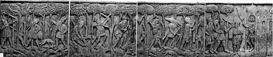 Рис. 39. Великий Новгород. Экпортные товары: 39.1. Резные деревянные панели скамьи купцов в ганзейской церкви св. Николая в Штральзунде (ок. 1360 г.), слева направо: охота на белку с луком, бортничество (с полной рубкой дерева и скоблением борти), повтор двух первых сюжетов (стрела с тупым наконечником, но могло быть и костяное навершие), новгородцы со связками мехов и приказчик подворья в Риге (брак шкурок возмещался наддачами); 39.2. Свеча восковая, круг воска, сколы (следствие колупания) с круга воска (X в.).