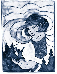 НЕБЕСНАЯ ДЕВА ЮМЫН УДЫРУ Кугу Юмо была дочь, прекрасная Юмын Удыр. Ее имя переводится как Небесная дева. Она – богиня-пряха, прядущая бесконечную серебряную нить, а ее веретено – та Великая ось, вокруг которой вращается все мироздание. Вероятно, в древнейших мифах Юмын Удыр была небесным божеством космического масштаба, но со временем ее образ приобретает более конкретные, человеческие черты.
