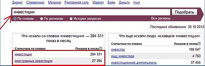 Видим, что запрос «Инвестиции» набирали 284 331 раз в октябре 2013 в регионе Россия. «Иностранные инвестиции» набрали больше 27 тысяч показов. Если вас интересует продвижение только в своем городе или регионе, то ставьте галочку «По регионам» и выбирайте интересующие вас города.