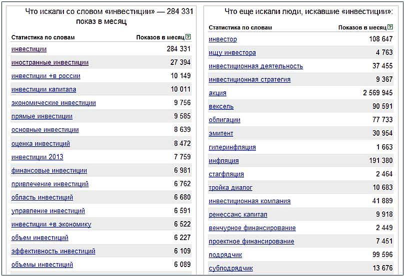 Обратите внимание на правый столбец, который появляется рядом: ―Что еще искали люди, искавшие «инвестиции» (см. рис. 2). Находящиеся в нем слова уточняют поисковые фразы. А именно, если человек не был удовлетворен результатами поиска по слову «Инвестиции», он делает уточняющий запрос: «Инвестор», «Ищу инвестора» и т. д. Кроме того, слова из правой колонки подскажут вам, как расширить список слов для продвижения сайта. Воспользуйтесь этими подсказками, т. к. они представляют ценную информацию о ваших потенциальных клиентах. В нашем примере мы делаем выводы о том, что в список ключевых слов для продвижения, кроме слова «инвестиции» можно включить такие слова как «венчурное финансирование», «проектное финансирование», конечно, при условии, что эти слова отражают специфику вашего бизнеса.