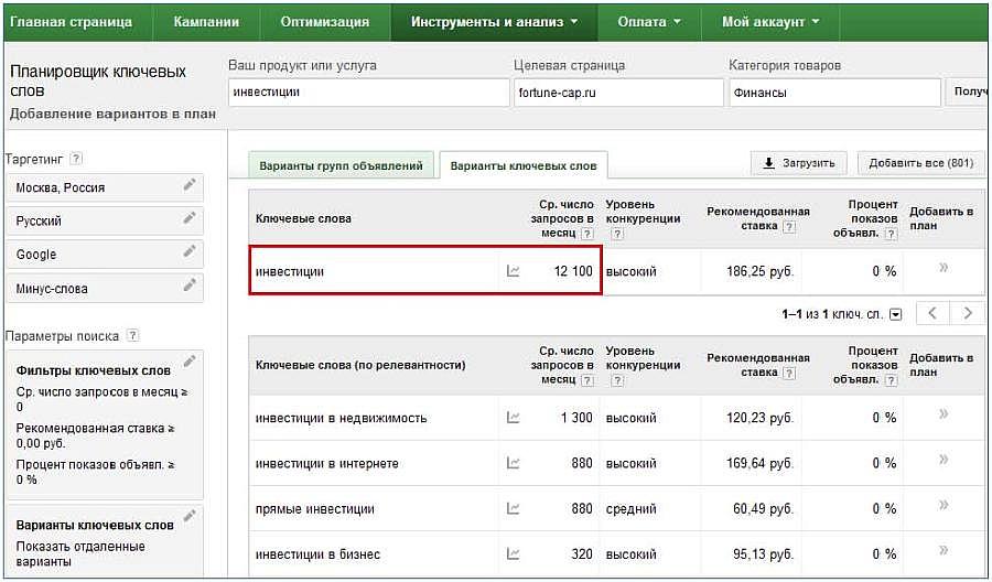 В Google слово «инвестиции» запрашивают примерно 12 000 раз в месяц. Рекомендуемые к продвижению ключевые слова «Инвестиции в недвижимость», «инвестиции в Интернет», «Инвестиции в бизнес». Сложно говорить о том, насколько пересекается аудитория Яндекс и Google. Вполне возможно, что ваши клиенты пользуются Яндексом и никогда Google, а возможно и наоборот. В любом случае, продвигайте свой бизнес в обеих поисковых системах, ведь клиенты никогда не бывают лишними.