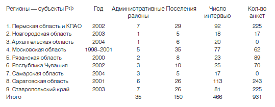 Путь снизу: полевые обследования, интервью и анкеты. Во время полевых исследований мы всегда старались сами посетить все намеченные нами для обследования районы и села. Даже анкетирование мы проводили только там, где были сами: личные впечатления очень важны для географа. Таким образом, всего за 1996–2004 годы нами было обследовано 35 административных районов в 8 субъектах РФ и лично изучено 153 поселения (см. табл. 1.2.1).