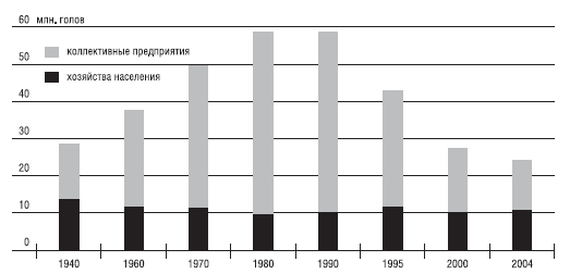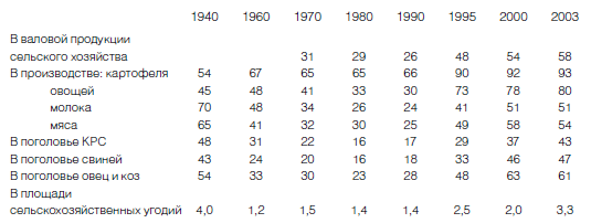 Несмотря на 70 лет искоренения частного хозяйства, оно оказалось бессмертно. К 1990 году индивидуальные хозяйства, включая сады и огороды, производили около 1/4 всей агропродукции страны, хотя их регистрируемые статистикой земли составляли всего 1,4 % угодий. Доля хозяйств населения была особенно велика в производстве картофеля (66 %), по остальным продуктам в 1980-х годах она составляла 25–30 %. В 2003 году индивидуальные хозяйства производили уже 58 % продукции (см. табл. 1.3.1), в том числе более 50 % молока и мяса, почти весь картофель и 80 % овощей (Основные показатели 2004а: 5–6). В отличие от крупных предприятий, они сохранили и даже увеличили поголовье частного скота (см. рис. 1.3.1), спасая тем самым животноводство в России.