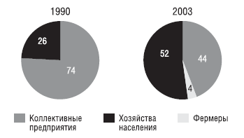 Таким образом, в 90-х годах именно хозяйства населения, сельские и городские, из-за огромной численности оказались более мощными производителями, чем фермеры и находящиеся в кризисе крупные предприятия.