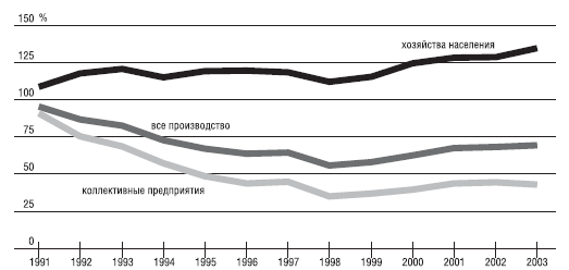 С 1997 года производство в крупных предприятиях, хотя и с переменным успехом, начало расти (см. рис. 1.4.2). Казалось бы, с его частичным восстановлением замещающие его индивидуальные хозяйства должны были бы начать свертываться. Однако с 1999 года наряду с оживлением коллективного сектора отмечается и рост продукции индивидуальных хозяйств. Это означает, что они имеют и внутренние резервы, и в этом нам тоже предстоит разобраться в настоящей книге.