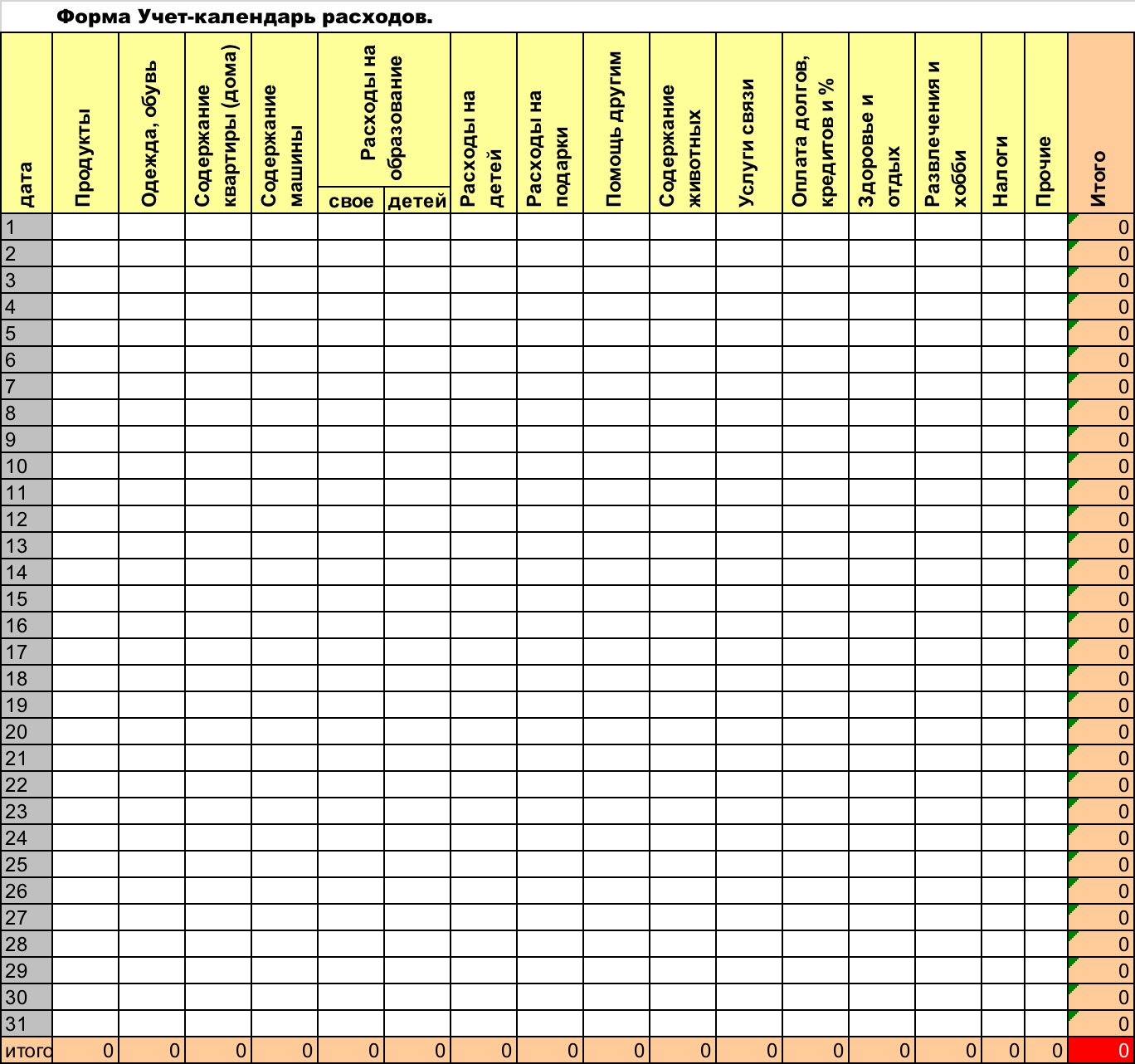 Для заполнения формы вам потребуется ежедневно вносить в нее все свои расходы. В графах «Итого» будет показываться сумма расходов как по дням (графа «Итого» справа), так и по статьям расходов (графа «Итого» снизу). В красной ячейке (внизу справа) вы увидите сумму всех своих расходов за весь месяц.