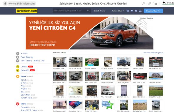 Объекты для аренды или покупки лучше всего искать на сайте Sahibinden.com. Изучим его детально (для того, чтобы это сделать, необходимо зарегистрироваться). Вот главная страница сайта: