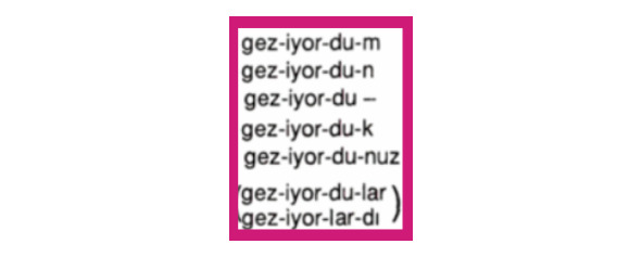 5. Öğle.. (исходный пад.) evvel saat yedi.. (местный пад.) (в семь часов утра) Moskova.. (апостроф + исходный пад.) Antalya.. (апостроф + направительный пад.) uçmak.. (причастие настоящего-прошедшего вр. -an/– en) bir uçak.. (местный пад.) (в самолете, летящем из Москвы в Анталию) iki adam (двое мужчин) yan yan.. (направительный пад.) (рядом друг с другом) oturmak.. (причастие прошедшего вр. -mış/-miş/-muş/-müş) (сев) konuşmak.. (определённый имперфект) (разговаривали).