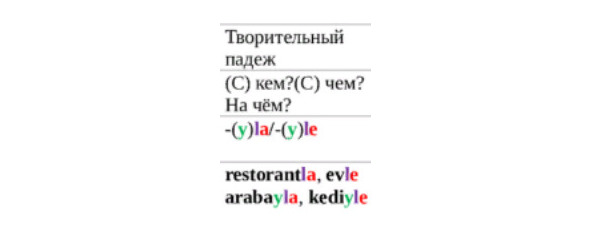 Belge.. (мн. ч. + винительный пад.) (документации) İngilizce (с английского), İspanyolca (испанского) ve (и) Türkçe.. (апостроф + исходный пад.) (турецкого) Rusça.. (апостроф + направительный = дательный пад.) (на русский) çevirmek.. (я перевод делаю).