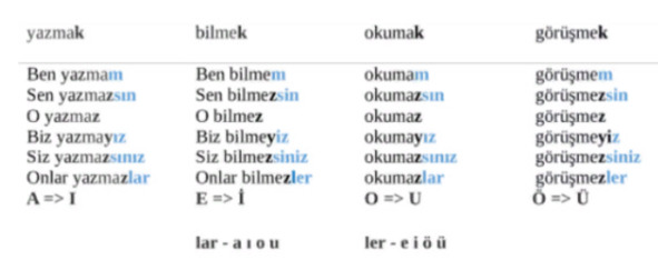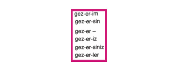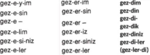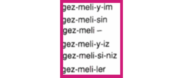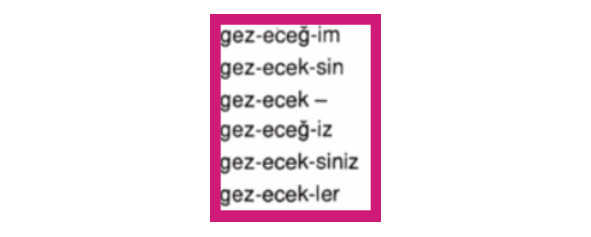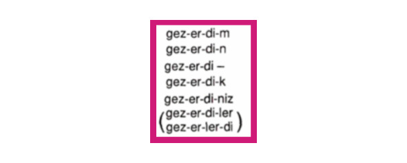 Ben yaz-dığı-mSen yaz-dığı-nO yaz-dığı-Biz yaz-dığı-mızSiz yaz-dığı-nızOnlar yaz-dık-larıBir süre sonra (некоторое время спустя), söz verilmek.. (оборот «который» – DIK) gibi (как и было обещано), kız (девочка) haşhaş tarla.. (3 л. ед. ч. + буфер + местный пад.) yeni.. (исходный пад.) belirmek.. (прошедшее категорическое вр.) (снова появилась на маковом поле).