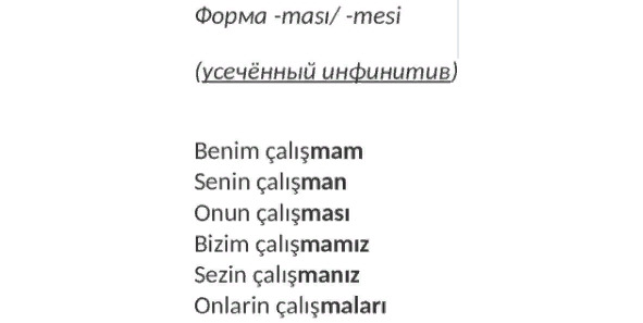 Korkmak.. (повелительное накл.) (не бойся). Anne.. (притяжательный афф.) doktor (моя мама – врач), her türlü yara.. (ед. ч., винительный пад.) (любые раны) nasıl iyileştirmek.. (развёрнутое доп. -eceğini) bilmek.. (настоящее широкое вр.) (она умеет лучить).