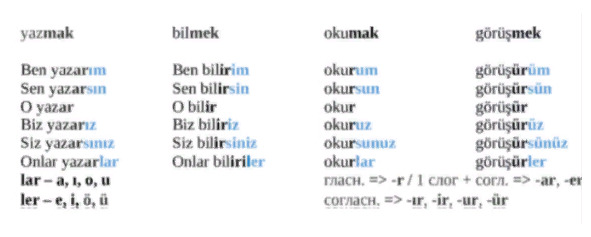 Sonra (потом) öğle.. (исходный пад.) sonra yaklaşık bir.. (местный пад.) (примерно в 1 дня) okul (в школьной) oda.. (3 л. ед. ч.) (столовой) yemek yer (настоящее широкое вр.) (он обедает).