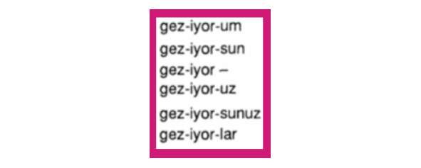 Önce (сначала) tuvalet.. (направительный пад.) (в ванную комнату) koşmak.. (настоящее продолженное вр.) (он бежит), sonra (потом) şimşek.. (творительный пад.) (молнией) mutfak.. (смена согласной + направительный пад.) (на кухню) koşuyor (бежит) ve (и) sonunda (наконец) ben.. (притяжательное местоимение + творительный пад.) (со мной) vedalaştık.. (исходный пад.) sonra (попрощавшись) ev.. (исходный пад.) (из дома) koşmak.. (конверб -arak/-erak) koşmak.. (настоящее продолженное вр.) (выбегает) ve (и) okul.. (направительный пад.) (в школу) gitmek.. (настоящее продолженное вр.) (направляется).