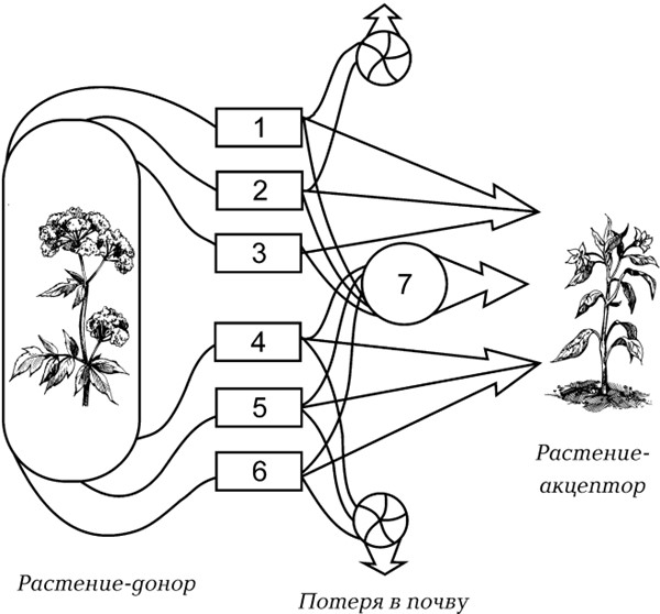 Растения оказывают на своих соседей и окружающую среду достаточно сильное химическое влияние, выделяя продукты жизнедеятельности и листьями, и корнями. Листья выделяют летучие вещества, иногда вещества растворены в стекающей с них воде. При вымывании дождевыми водами минеральных солей листья деревьев теряют калий, натрий, магний и другие микроэлементы. Корни выделяют химические вещества в омывающую их воду. Корневые выделения (особенно от многолетников), имеющие свойство накапливаться, оказывают наиболее сильное воздействие на окружающие их растения. Влияние через выделения из листьев и корней обычно наблюдается лишь при непосредственной близости растений (рис. 2).