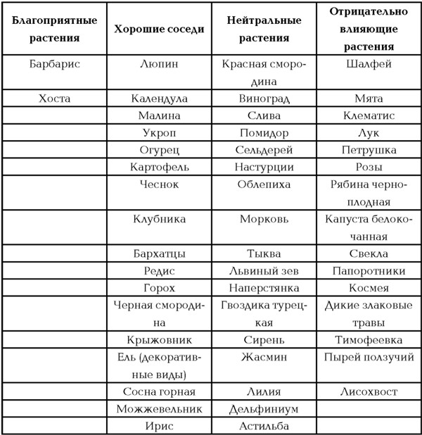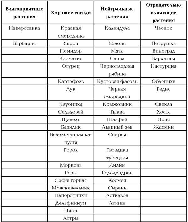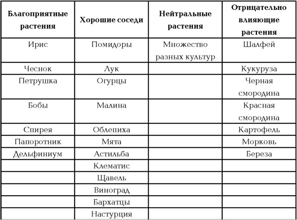 При выращивании малины также нужно учитывать влияние на нее различных растений, поскольку у нее имеются свои «друзья» и «недоброжелатели» (табл. 2).