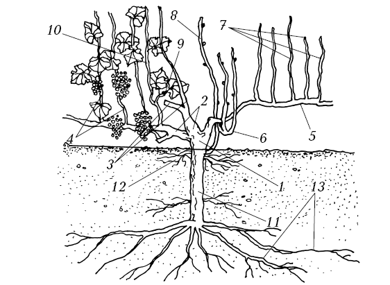 Рисунок 2. Общее строение виноградного куста: 1 – голова куста; 2 – рукава; 3 – плодовое звено; 4 – плодоносные побеги; 5 – стрелка плодоношения; 6 – сучок замещения; 7 – однолетние побеги или лоза; 8 – порослевый побег; 9 – пасынок; 10 – бесплодный побег; 11 – подземный штамб; 12 – росяные корни; 13 – корневая система