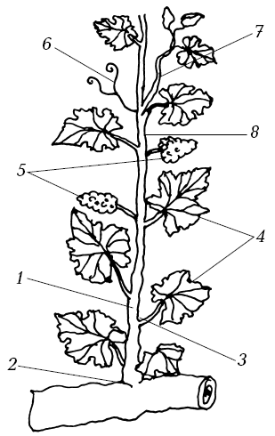 Рисунок 3. Плодоносный побег винограда: 1 – плодовая лоза; 2 – узел; 3 – пазушная почка (глазок); 4 – лист; 5 – соцветие; 6 – усик; 7 – пасынок; 8 – междоузлие