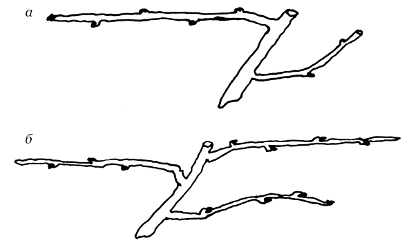 Плодовым звеном называется сочетание на рукаве двух лоз: сучка замещения на 2 – 3 глазка и лозы плодоношения на 4 – 6 и более глазков. Плодовые звенья бывают рядовыми и усиленными. Рядовые плодовые звенья состоят из одной лозы стрелок и одного сучка замещения (рис. 5, а). Усиленные плодовые звенья состоят из двух лоз стрелок и одного сучка замещения (рис. 5, б).