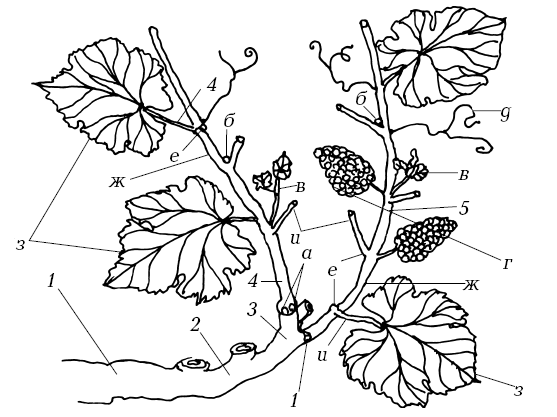 Рисунок 6. Часть стебля виноградной лозы: 1 – многолетняя часть (рукав), 2 – трехлетняя часть, 3 – двухлетний (прошлогодний) побег, 4 – однолетний бесплодный побег, 5 – однолетний плодовый побег: а) сближенные (угловые) почки у основания побега, б) пазушные почки, в) пазушные побеги (пасынки), г) соцветия, д) усики, е) узлы, ж) междоузлия, з) листья, и) черешки листьев