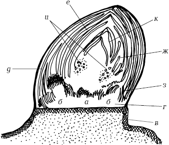 Рисунок 7. Продольный разрез зимующего глазка: а – главная почка, б – замещающие почки первого порядка, в – подушечка, г – донце, д – кроющие чешуйки, е – волоски, ж, з – зачаточные листья главной и замещающей почек, и – зачаточные соцветия, к – зачаток усика