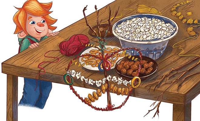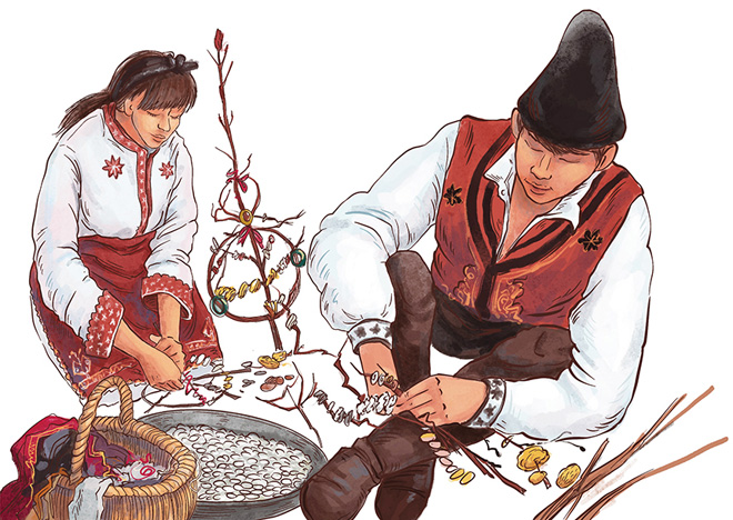 – Отлично! Теперь укрась веточку красными нитками, монетками. Можешь сушёные абрикосы и орешки привязать. О, да у тебя замечательная сурвачка получилась!