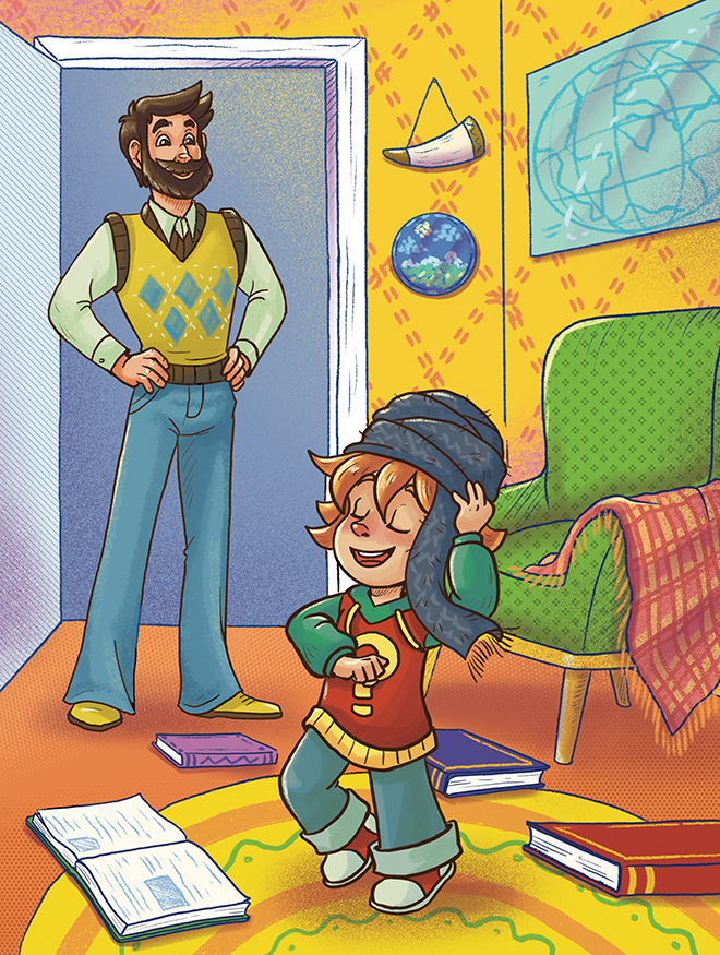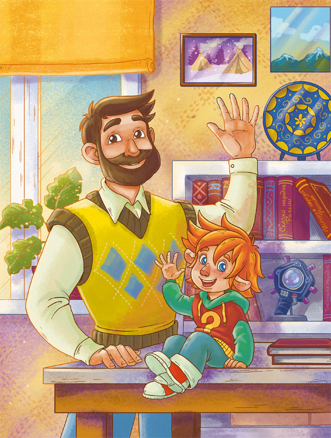 Здравствуйте, ребята! Меня зовут Чевостик. Я живу на книжной полке в библиотеке у дяди Кузи. Не удивляйтесь, я небольшого роста, а нижняя полка в книжном шкафу дяди Кузи очень высокая и просторная, поэтому мне на ней хорошо и удобно. Какой я? Похож на обыкновенного мальчишку, волосы рыжие, характер весёлый. Дядя Кузя в шутку зовёт меня Чевочкой с хвостиком. Но никакого хвоста у меня нет, зато есть ушки на макушке. Больше всего на свете я люблю узнавать новое, поэтому всё время задаю всякие вопросы дяде Кузе. О чём бы я ни спросил, он всё знает и мне рассказывает. Это потому, что дядя Кузя очень умный. Он прочитал много-много разных книг. А ещё мы с ним любим путешествовать! В путешествиях нам помогает времяскок. Это такой прибор, его дядя Кузя изобрёл. Набираешь на времяскоке место и время, куда хочешь попасть, раз, два – и уже там! Сегодня мы наверняка тоже куда-нибудь отправимся!