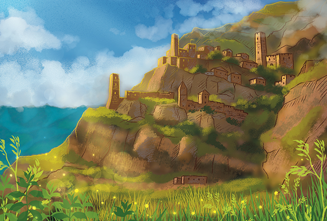 – Не волнуйся, Чевостик. Посмотри, как мудро построен аул: он расположился на краю обрыва на огромной – почти две тысячи метров – высоте. Под нами, как ты уже заметил, тоже горы. Нелегко врагам сюда забраться! А если заберутся, их неприятный сюрприз ждёт. Недаром Гоор прозвали «Страной семи башен»…