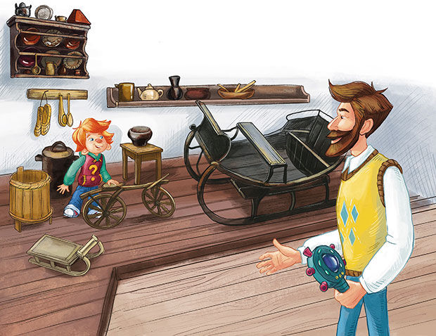 – Ой, да тут много всяких интересных вещей: и сани, и смешной велосипед – деревянный. Никогда не видел таких.