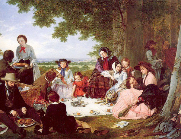 В конце XVIII века, в Англии началось движение поэтов-романтиков. Они не принимали бурной индустриализации того времени. Их одухотворенная поэзия привила любовь к природе и их читателям. Среди высших и средних классов стало модно есть в хорошую погоду на свежем воздухе, у себя в саду, называя это пикником. На эти обеды часто приглашали знакомых, но готовили, разумеется, кухарки, поэтому приносить еду с собой никто не просил. Они были очень плотными, с закусками, вторым и сладким, а также полным комплектом столовых приборов. Но находились и любители пеших походов к морю или в горы, поэтому очень скоро возникла традиция выходить на природу специально с целью поесть в каком-нибудь уединенном месте с живописным видом. Эти пикники мало чем отличались от садовых – те же столы, стулья, изысканная еда и многочисленные слуги, которые должны были всё это переносить с места на место.