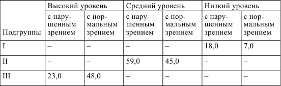 Обследование связной речи детей с амблиопией и косоглазием выявило следующее, что в зависимости от состояния зрительного и речевого развития испытуемые составили три подгруппы (см. табл. 2).