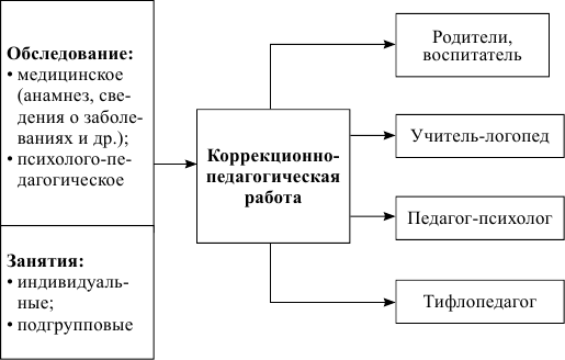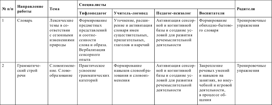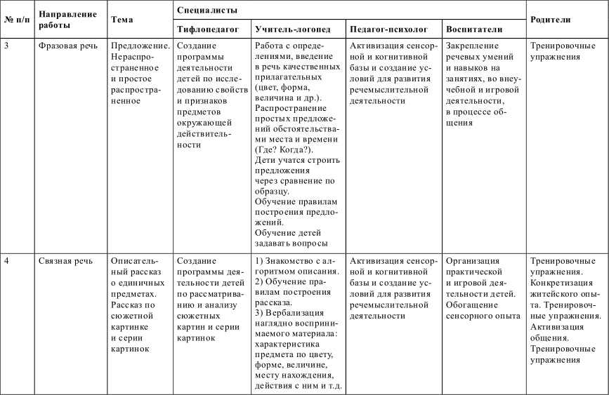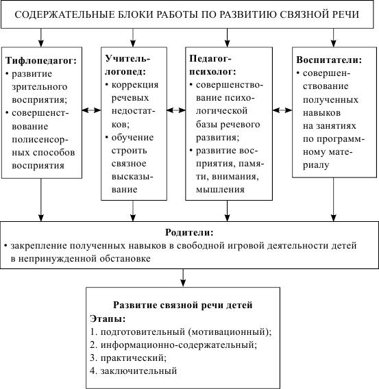 • проведение специальных коррекционно-педагогических приемов развития связной речи на занятиях всех специалистов дошкольного учреждения (тифлопедагога, педагога-психолога, учителя-логопеда, воспитателя);