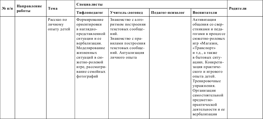 Методика развития связной речи у старших дошкольников с амблиопией и косоглазием строилась с учетом комплексного подхода, так как эпизодическая работа на занятиях по развитию речи не может полностью сформировать необходимые речевые навыки, а непосредственная и всеобъемлющая взаимосвязь специалистов (тифлопедагога, учителя-логопеда, педагога-психолога) и родителей обеспечивают эффективность коррекционно-педагогической работы в целом. Комплексность коррекционно-развивающей работы по обучению дошкольников рассказыванию отражена на схеме 4 и таблице 7.