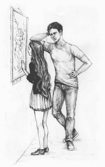 Терпение парня было на пределе – он стоял рядом с картиной, которую рассматривала девушка, и начал шутливо биться головой о стену, причитая:
