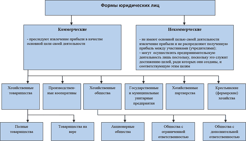 Юридические лица дифференцированы, во-первых, по цели деятельности на коммерческие и некоммерческие организации (см. схему: «Организационно-правовые формы юридических лиц»), во-вторых, в зависимости от характера правомочий учредителей – в отношении имущества юридического лица. Одну группу составляют хозяйственные товарищества и общества, производственные и потребительские кооперативы, являющиеся юридическими лицами, в отношении которых их участники имеют обязательные права, т. е. определенные законом и учредительным договором. Другая группа юридических лиц, на имущество которых участники имеют право собственности, представлена унитарными предприятиями и финансируемыми собственником учреждения. Наконец, третья группа – общественные и религиозные организации, благотворительные фонды, союзы и ассоциации юридических лиц, в отношении которых участники не имеют имущественных прав и обязательств.