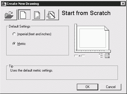 При создании рисунка по простейшему шаблону используется пиктограмма Start from Scratch. В данном режиме устанавливается британская или метрическая система единиц. Значения многих системных переменных, принятые по умолчанию, зависят от того, какая из двух систем выбрана. Эти переменные управляют текстом, размерами, сеткой, режимами привязки, а также устанавливают действующие по умолчанию тип линий и файл образцов штриховки: