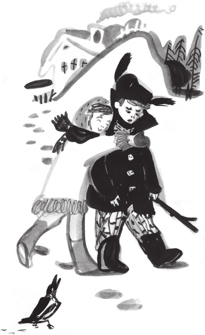 Она берёт его за руку в холодной мокрой варежке. Он отдёргивает руку: