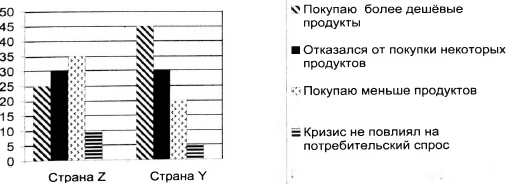 10. Учёные изучали потребительское поведение жителей стран Z и Y в условиях экономического кризиса. На гистограмме приведены данные (в % от числа отвечавших) о том, как в течение года изменился потребительский спрос.