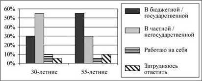 2) Среди опрошенных 55-летних тех, кто работает в бюджетной/государственной организации, больше тех, кто работает в частной/негосударственной организации.
