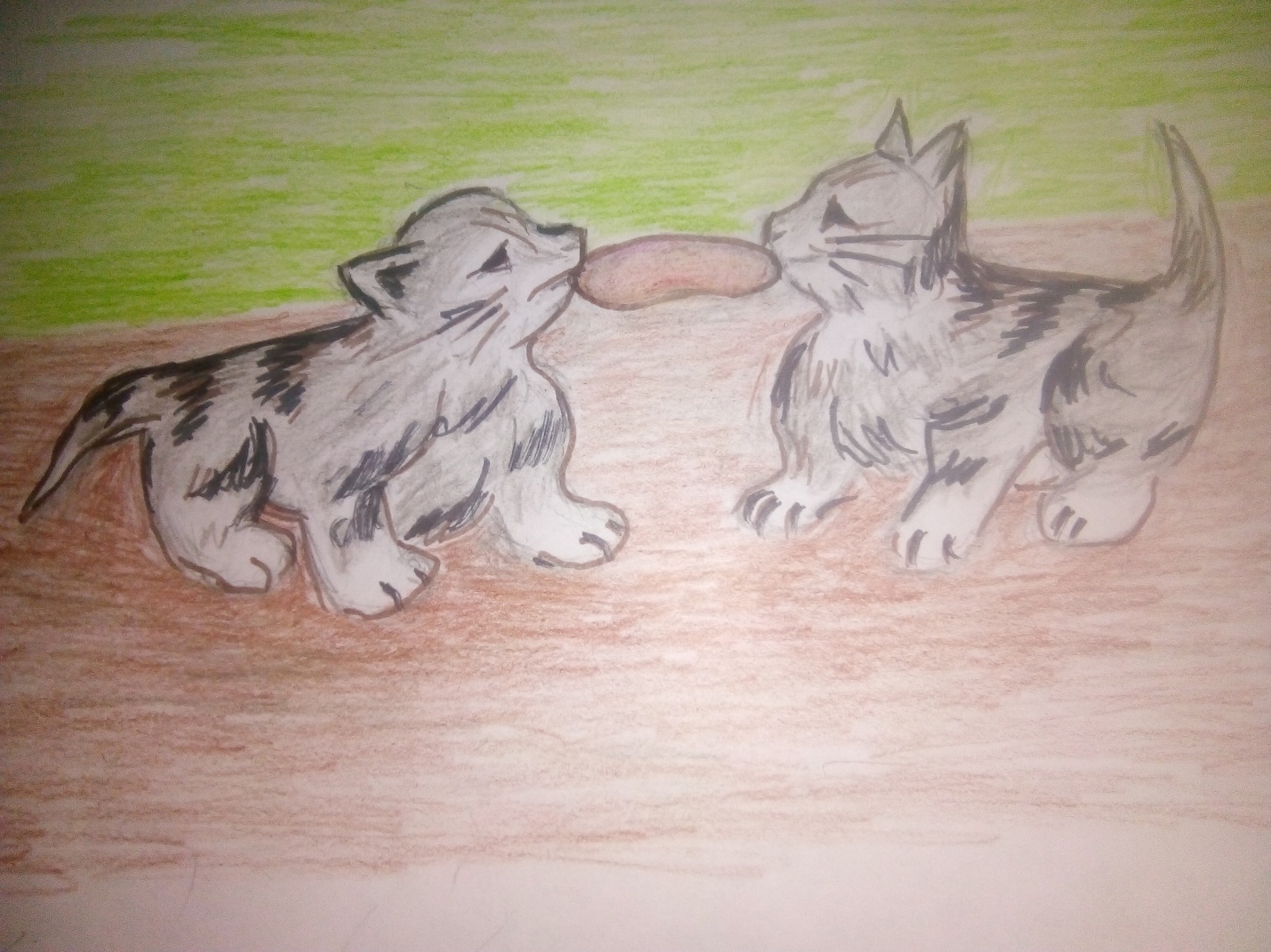 Чуть в стороне от нее расположились два милых котенка, как две капли воды, похожие на мать. Ухватившись за одну сардельку, с разных концов, они угрожающе урчали друг на друга. Но ни один из них не хотел уступать другому первенство. В этот самый момент Мурка заметила непрошенного гостя.