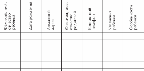 Вам необходимо также записать ФИО и родителей, номер телефона, по которому вы могли бы с ними связаться. Это иногда бывает необходимо. Порой полезна информация и о роде деятельности родителей подопечных. Возможно, благодаря ей вы хотя бы примерно сможете предугадать, чего можно ожидать от того или иного ребенка. Однако здесь не следует особенно уповать на родственную преемственность. Нередко оказывалось так, что дети образованных и культурных родителей оказывались отъявленными сорванцами и лоботрясами. И наоборот, у меня были ребята из неблагополучных семей, отличавшиеся разумностью и трудолюбием.