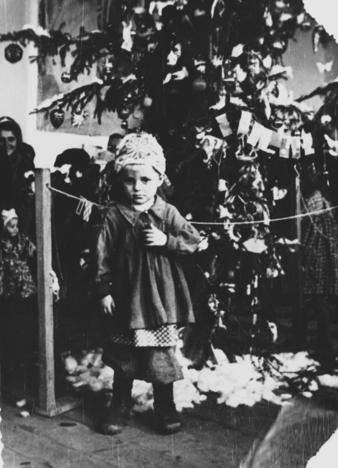 Повели на елку в школу, где училась старшая сестра. На мне одежда в несколько ярусов. Короткая кацавейка, из-под неё видно платье в горошек, из-под платья байковые шаровары а-ля Тарас Бульба, потом ботиночки на шнуровке. Главное на голове – это корона, обклеенная ватой и расшитая битыми елочными игрушками. Фотография у елки, на лице серьёзность, какую может позволить себе трехлетний ребёнок.