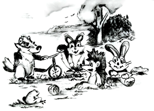 Барсучок не был жадиной. Он разрешил всем по очереди прокатиться на самокате. Зверята забыли про мяч и занялись новой игрой! Один на самокате катит, а все остальные бегут за ним вдогонку! Набегались, запыхались! Устали, проголодались!