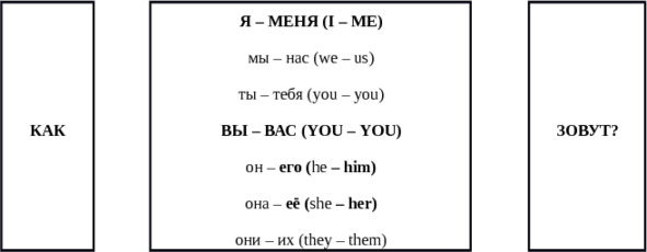When this question is addressed to you, it contains the pronoun ВАС, in a reply ВАС is replaced by the pronoun МЕНЯ. When you want to know the name of another person, you should ask: – Как ЕГО (ЕЁ, ИХ) зовут? In a reply the pronoun doesn’t change: