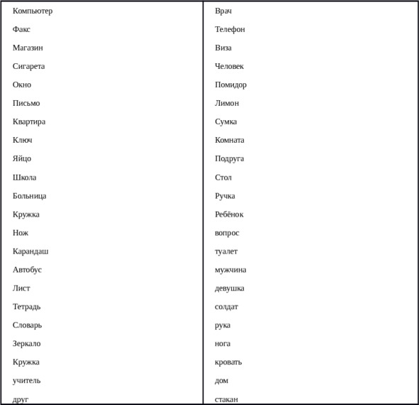 Сестра, брат, машина, скайп, интернет, компьютер, телевизор, собака, окно, молоко, паспорт, виза, кошка, ручка, туалет, пиво, Япония, Китай, Россия, университет.