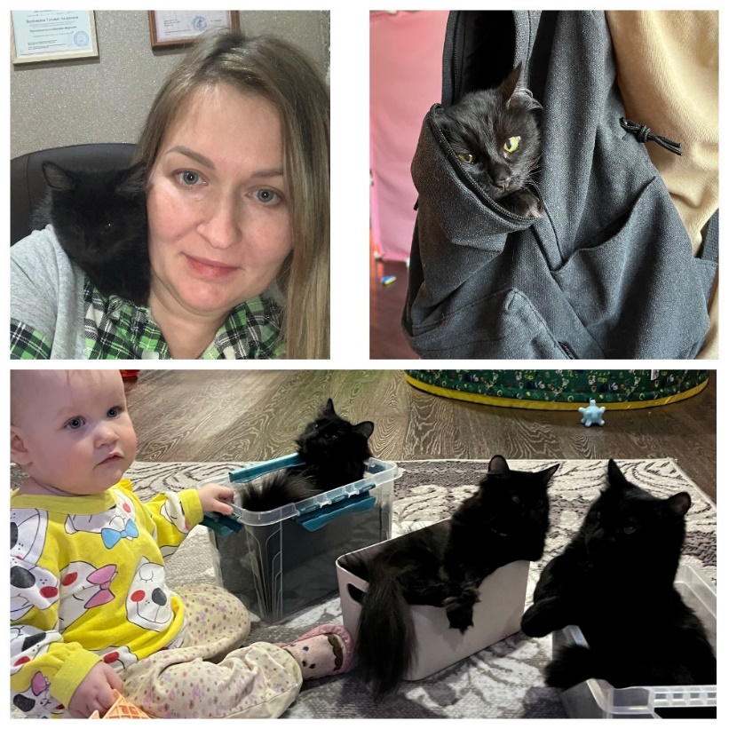 На нем младшая дочь Аня и кошечки, которые для меня как дети. Они особенные, каждый день радуют всю семью. Повадки часто совсем не кошачьи. К примеру, одна из них любит запрыгивать на плечи и кататься. Другая постоянно ходит за мной хвостиком, как маленький ребенок. Третья садится за кухонный стол, когда мы едим. Да, и эти пластиковые коробки, что на фото, чего стоят! Одно из их любимых мест.