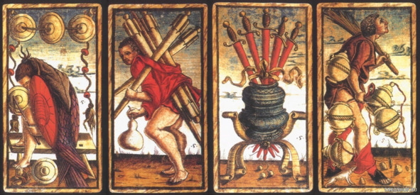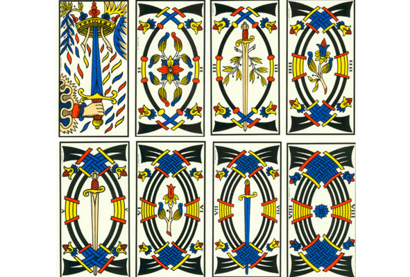 Нельзя не заметить, что Младшие Арканы в масти Мечей образуют взаимосвязанный симметричный узор, который начинается окружностью из одной линии, а заканчивается толстым массивным кольцом из нескольких слоев (рис. 1). Идеальная симметрия, контрастные и яркие цвета – главная особенность Марсельского Таро. В этом его и узнаваемый авторский стиль.